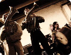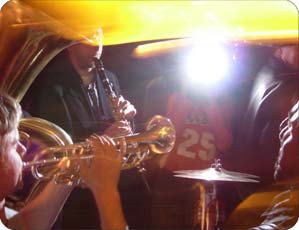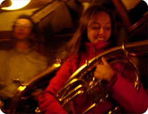 wo es dermaßen eng zuging, dass sich die Rhythmusgruppe auf die Tische zurückzog, mit den Köpfen in den Kronleuchtern …